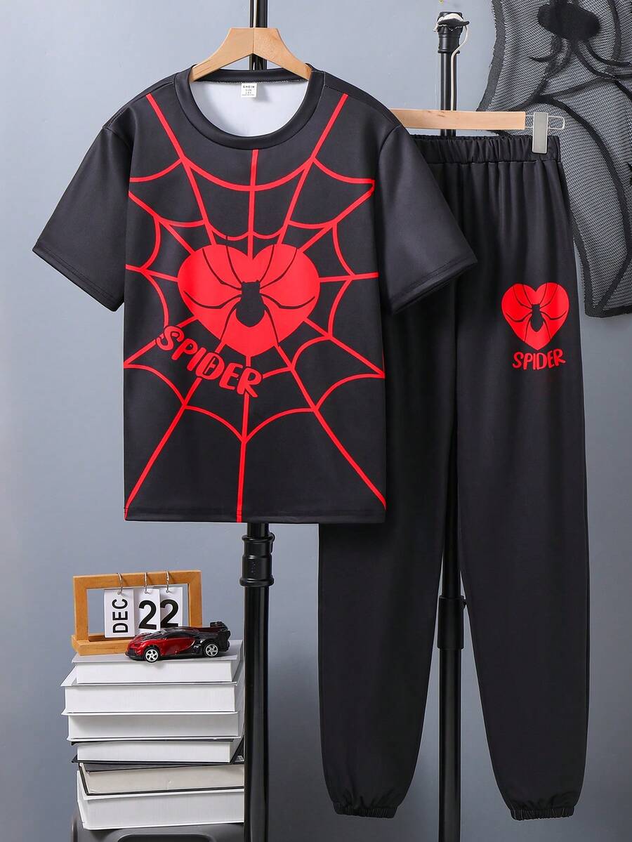 Teenage Boys' Spider Web Printed Short Sleeve T-Shirt And Long Pants Set