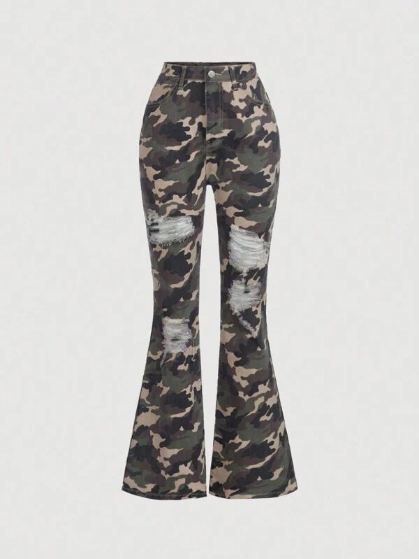 SHEIN Teenage Girls' Camouflage Print Casual High Waist Flared Jeans