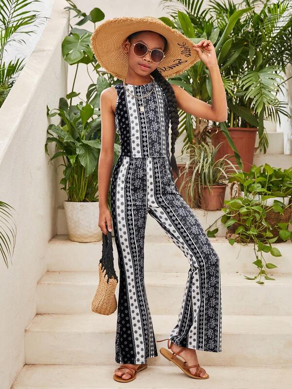 SHEIN Kids Cooltwn Teenage Girls' Casual Vacation Floral Printed Round Neck Sleeveless Vest And Flared Pants Set