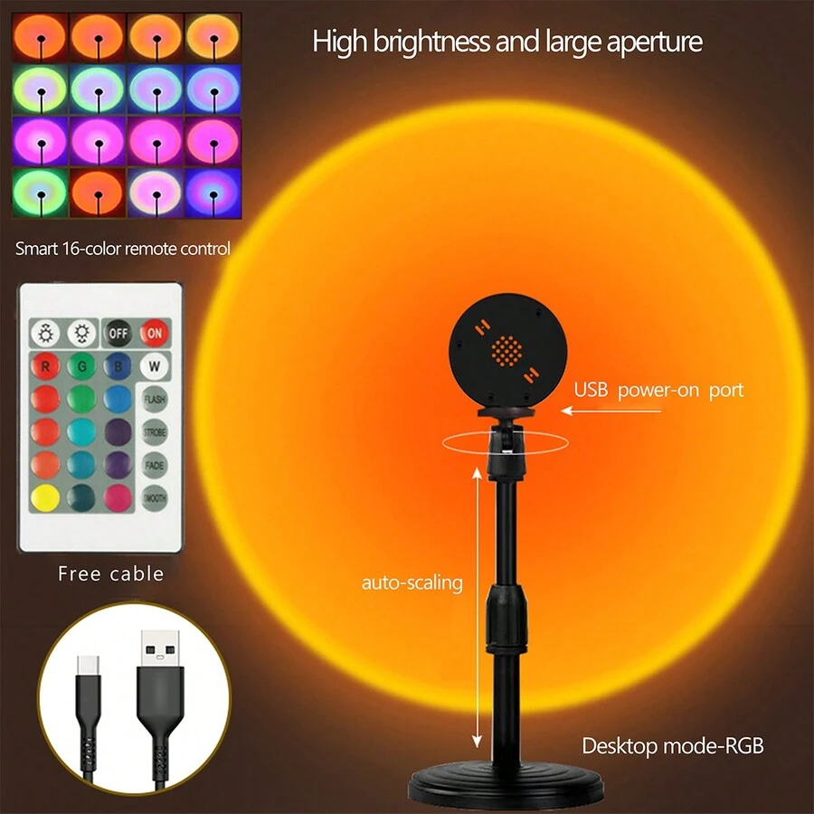 The Romantic Light Across Time And Space! Experience The Ultimate Quality Of This Taiwan-Style Sunset Lamp, With 16 Colors Intelligent App Control, Led Sunset Lamp With Remote Control, 360°Rotatable Design, And Freely Adjustable From 28cm To 40cm, Creating A Wonderful Light Projection Of Sunset. It Is Not Only Suitable For Selfie Atmosphere Lighting, But Also For Hanging On The Wall To Light Up Paintings, Bringing Unique Atmosphere To Live Broadcasts, Bedrooms, Parties And Living Rooms. Quality Assurance, Taking You To Enjoy The Beauty Of Cross-Border Sunset!