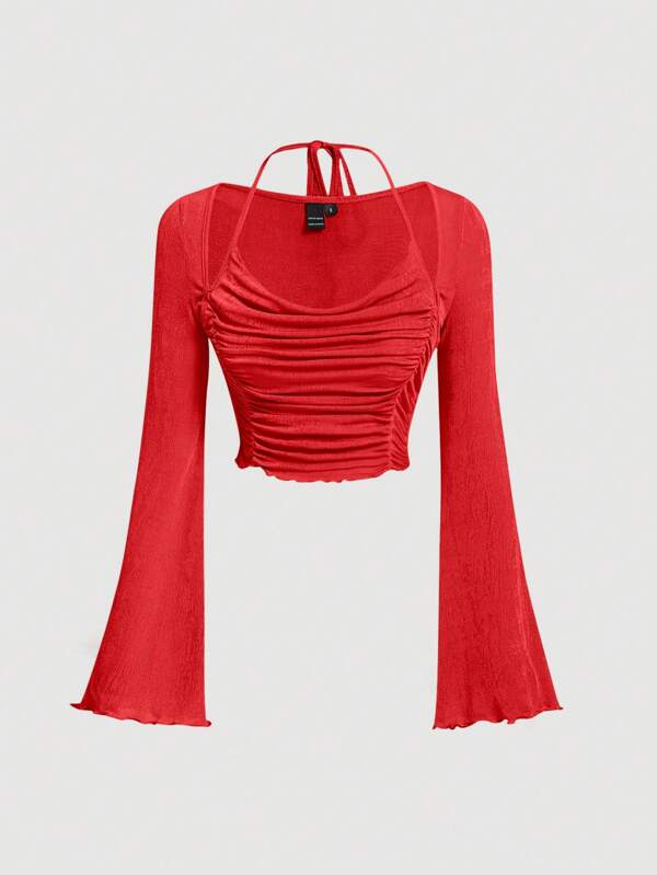 SHEIN MOD Tie Back Lettuce Trim Ruched Front Crop Tee