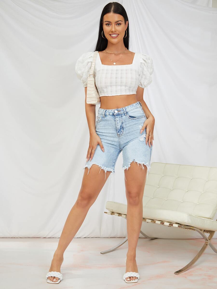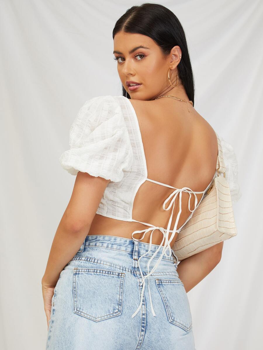 SHEIN VCAY Tie Backless Puff Sleeve Crop Top