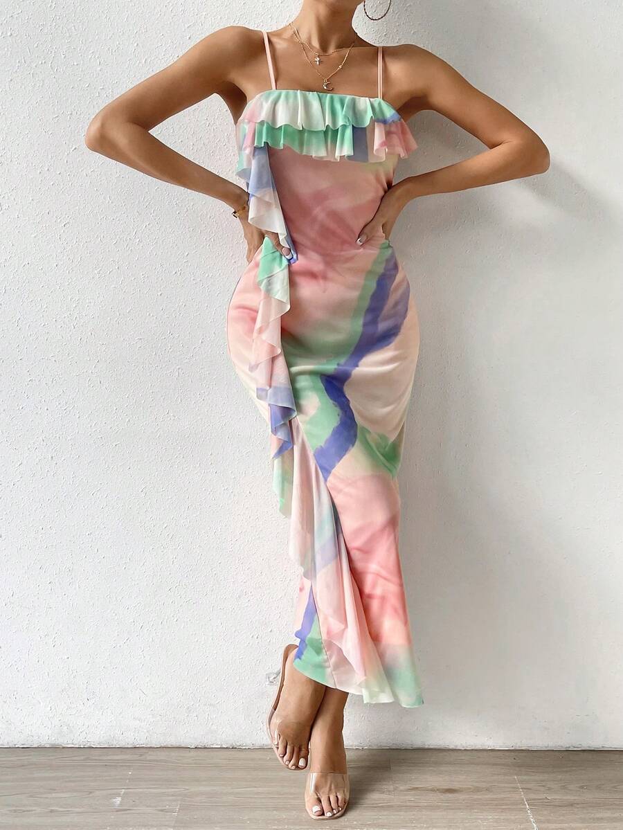 SHEIN Privé Tie Dye Ruffle Trim Cami Dress