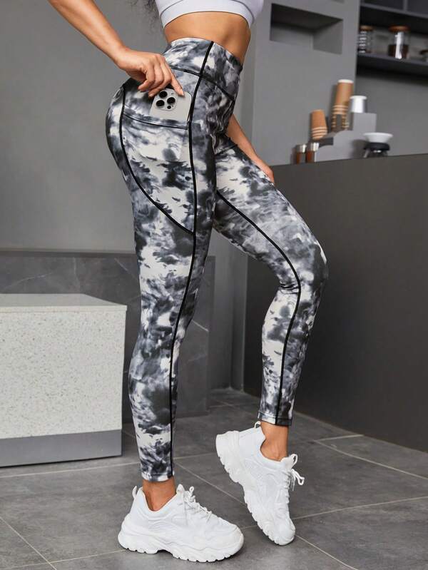 SHEIN Yoga Trendy Tie Dye Top-stitching Wideband Waist Sports Leggings With Phone Pocket