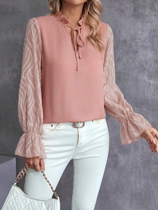 Tie Neck Flounce Sleeve Blouse