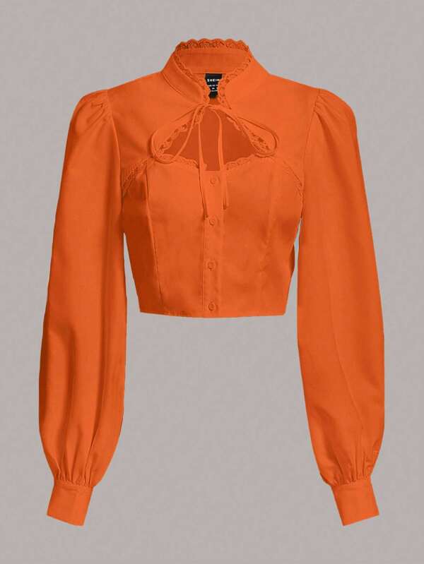 SHEIN Privé Tie Neck Lace Trim Lantern Sleeve Crop Blouse