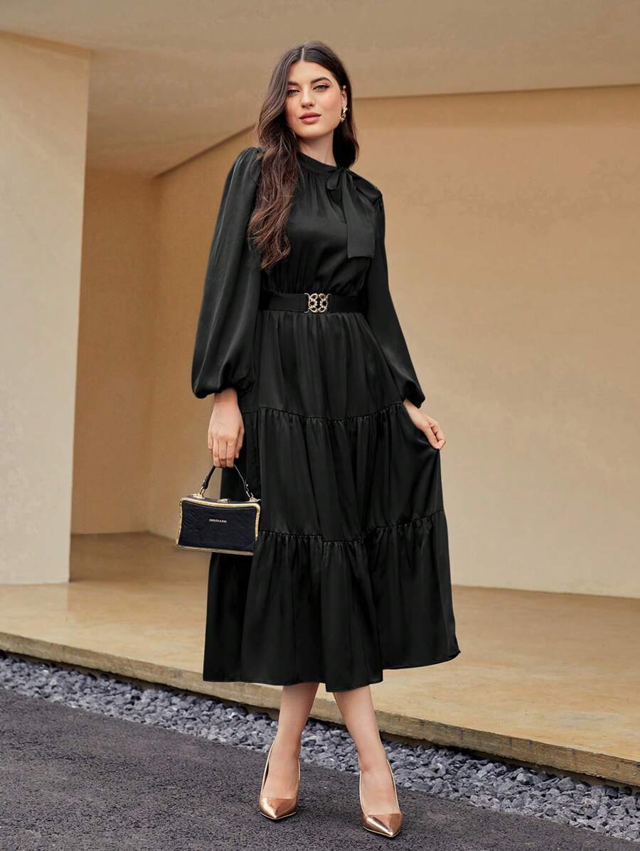 SHEIN Modely Tie Neck Lantern Sleeve Ruffle Hem Belted Satin Dress