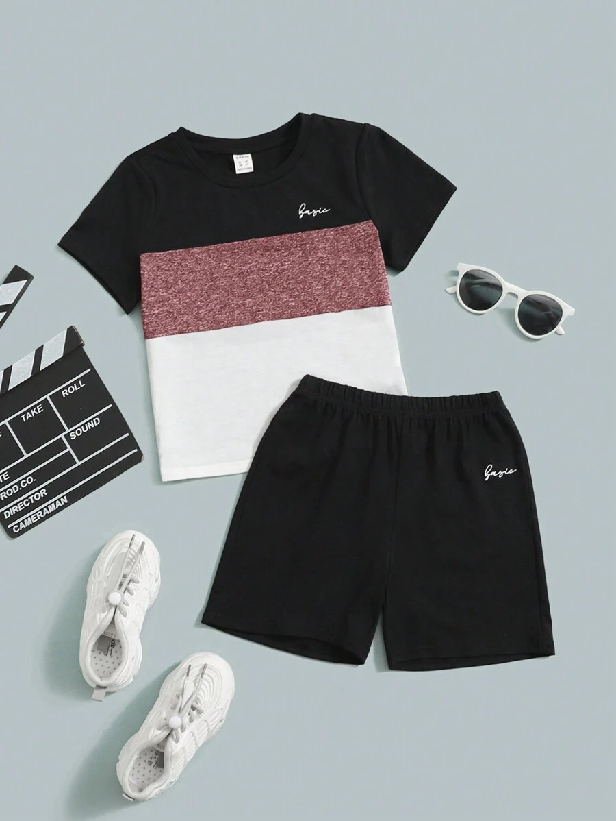 SHEIN Kids SPRTY Toddler Boys' Casual Comfortable Letter Print Color Block Short Sleeve T-Shirt And Shorts Set