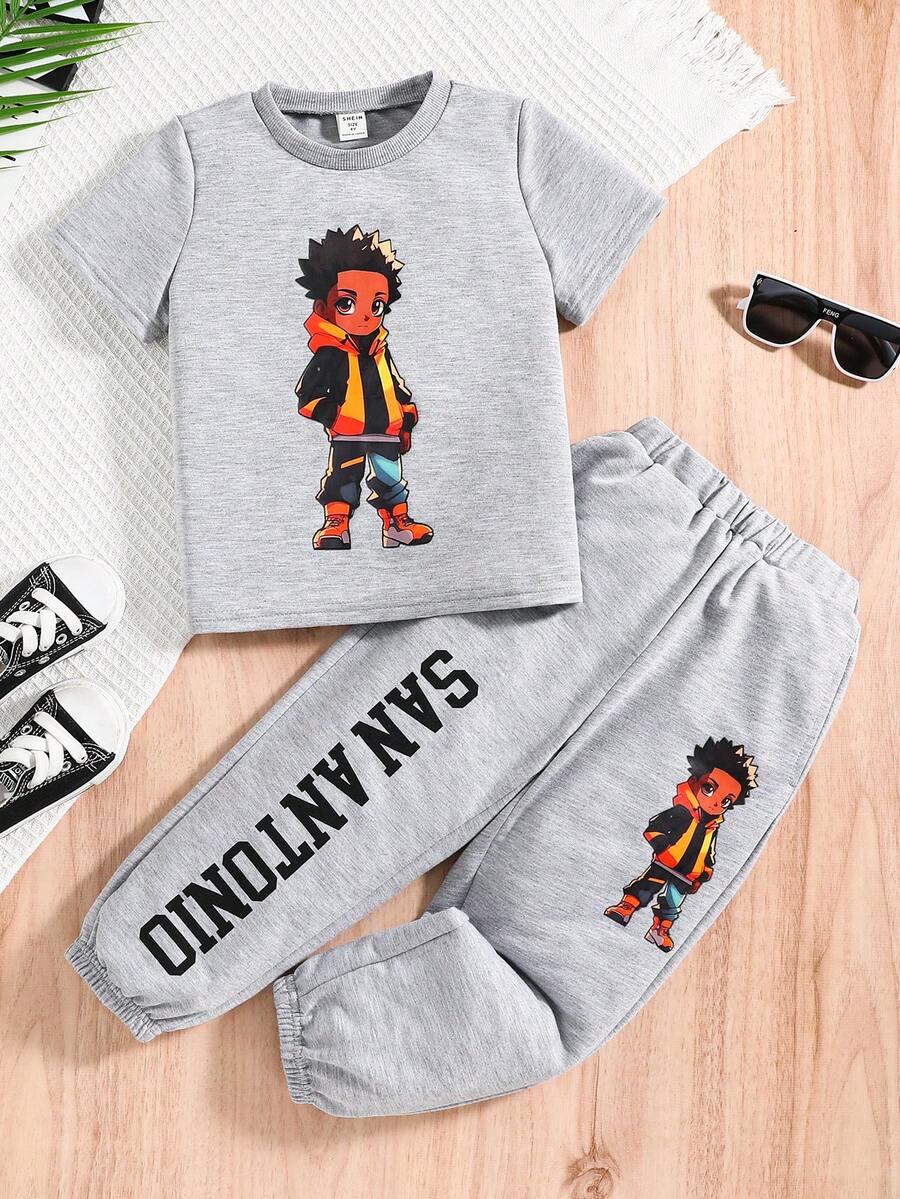SHEIN Toddler Boys' Cute And Comfortable Cartoon Character Pattern Short Sleeve Top And Knitted Cuffed Long Pants Set