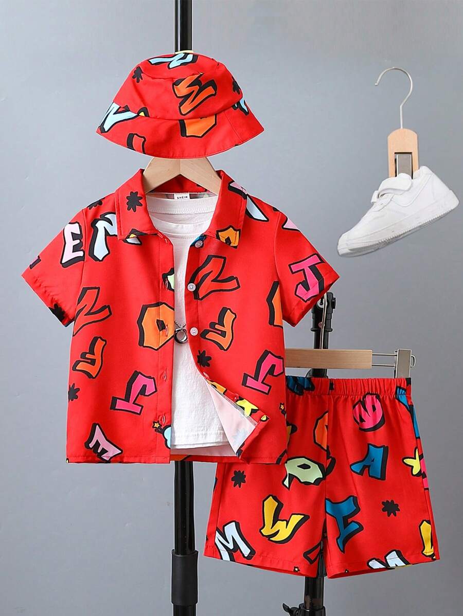 SHEIN Toddler Boys' Letter Print Short Sleeve Shirt And Shorts Set With Hat