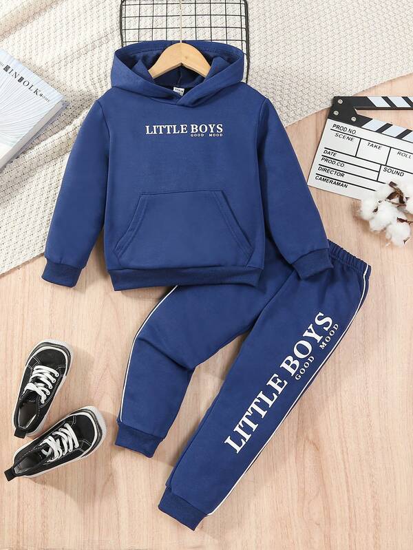 SHEIN Kids EVRYDAY Toddler Boys' Long Sleeve Hooded Casual Sweatshirt And Jogging Pants Set For Spring And Autumn