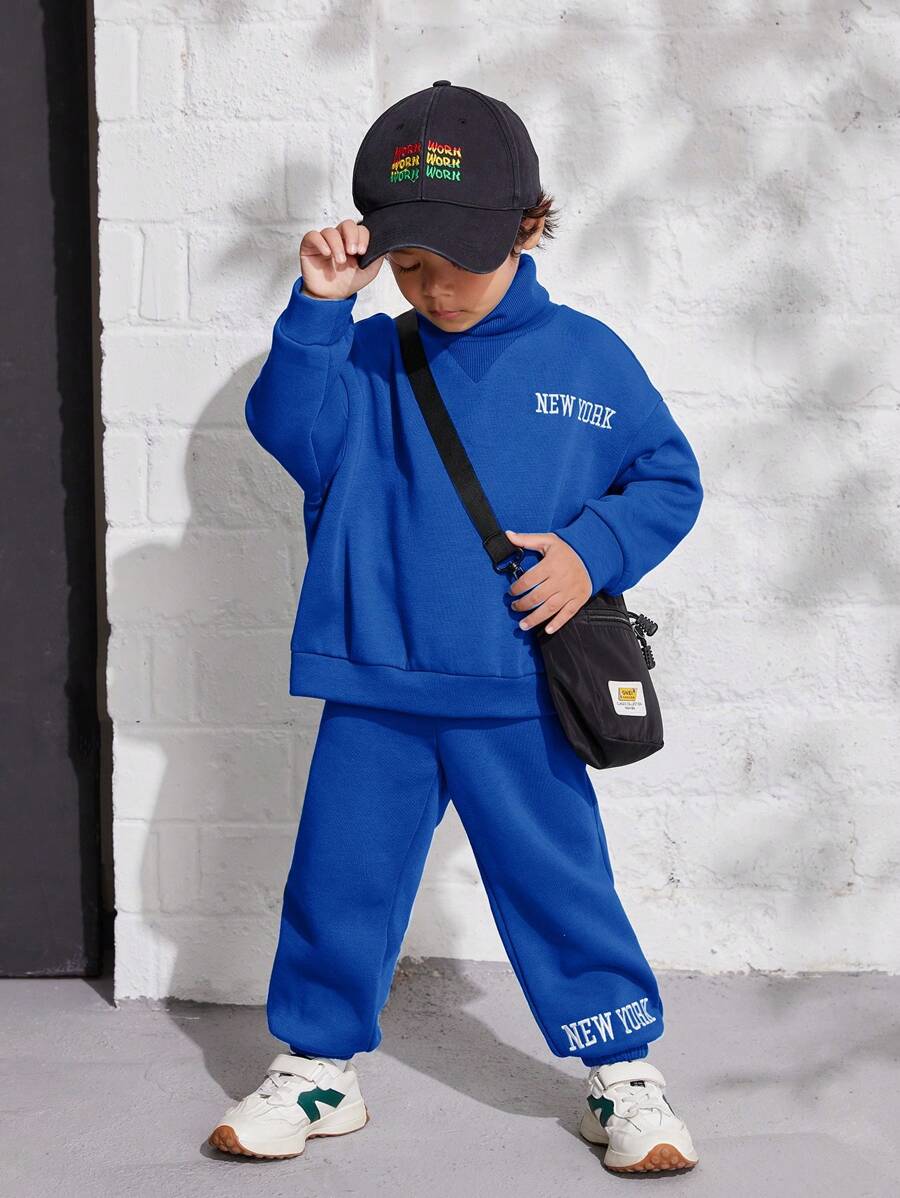 SHEIN Young Boy Loose Fit College Style High Neck Letter Printed Sweatshirt And Long Pants Two Piece Set