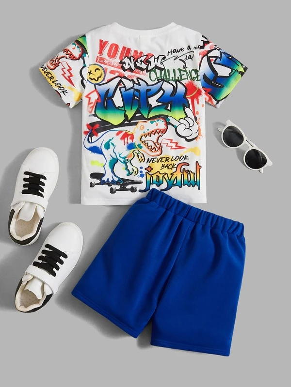 SHEIN Kids HYPEME Toddler Boys Dinosaur and Slogan Graphic Tee & Shorts