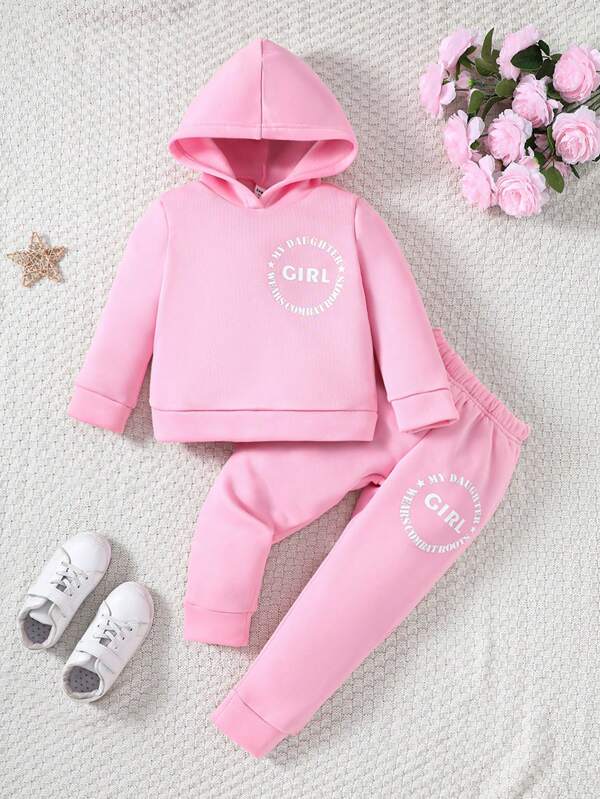 Toddler Girls' 2pcs Casual Hooded Sweatshirt And Sports Pants Set With Letter Print, Suitable For Spring And Autumn