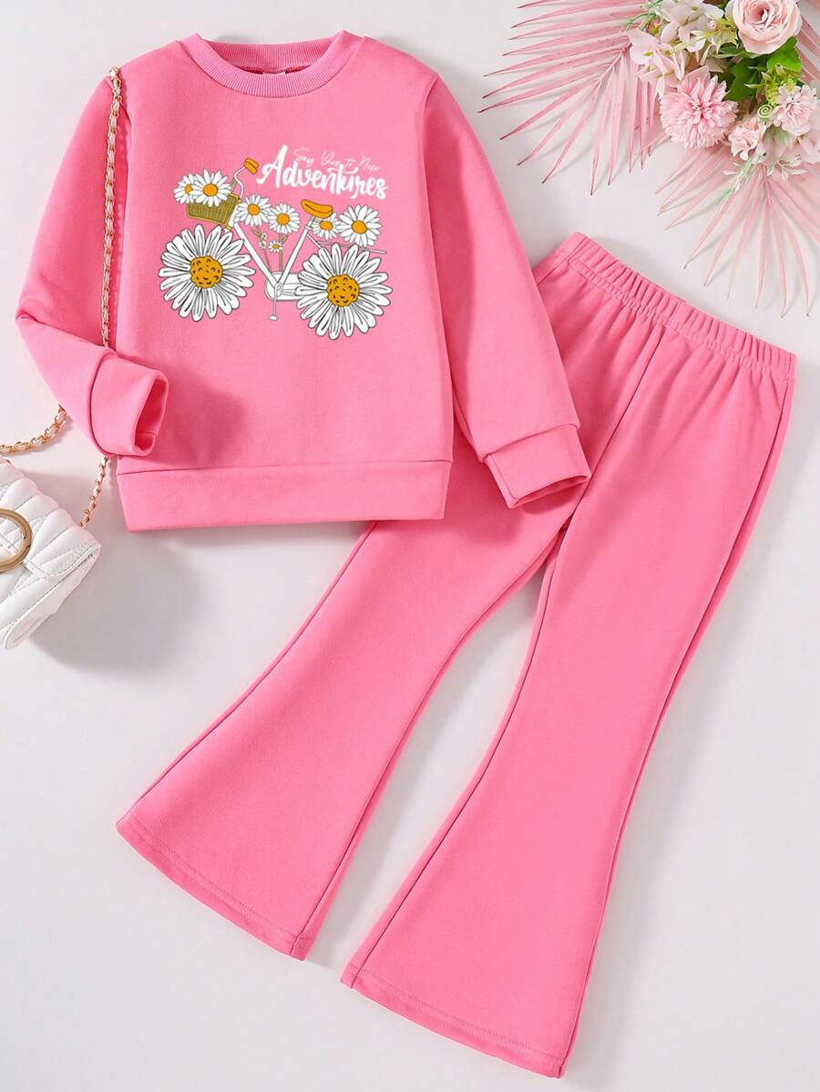 Toddler Girls' Floral & Letter Printed Round Neck Sportswear And Bell-Bottom Pants