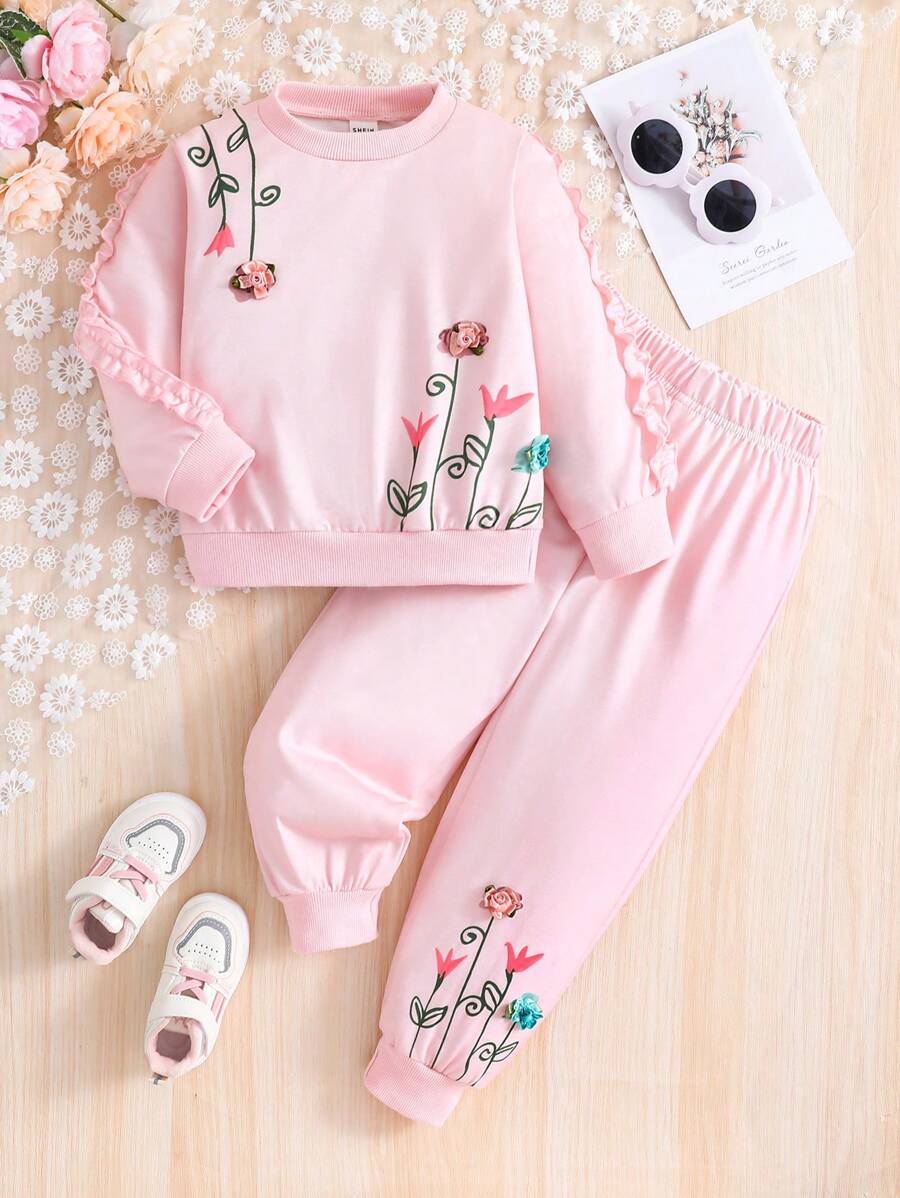 SHEIN Kids CHARMNG Toddler Girls' Flower Pattern Sweatshirt Set With Fashionable Style For Fall/Winter
