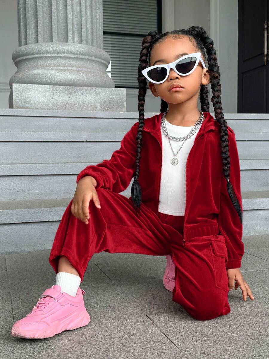 SHEIN Kids Cooltwn Toddler Girls' Velvet Zipper Hooded Jacket And Pants Set