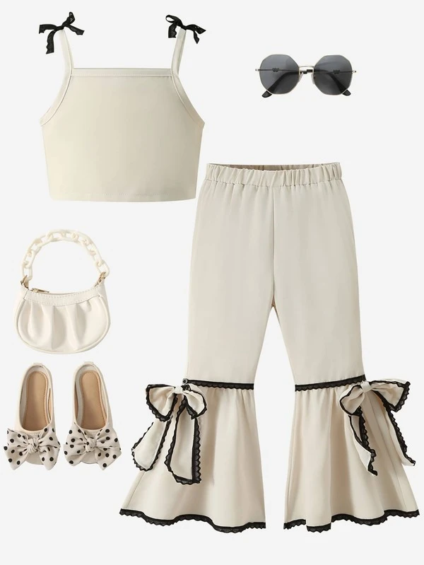 SHEIN Kids EVRYDAY Toddler Girls 1pc Tie Shoulder Cami Top & 1pc Bow Front Flare Leg Pants