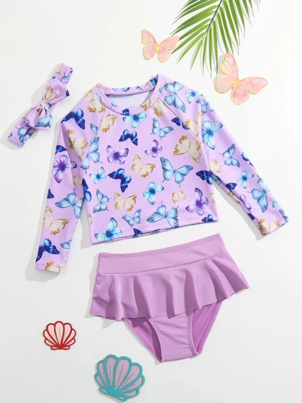 Toddler Girls Butterfly Print Ruffle Hem Bikini Swimsuit & Headband