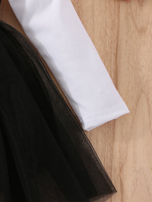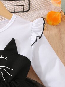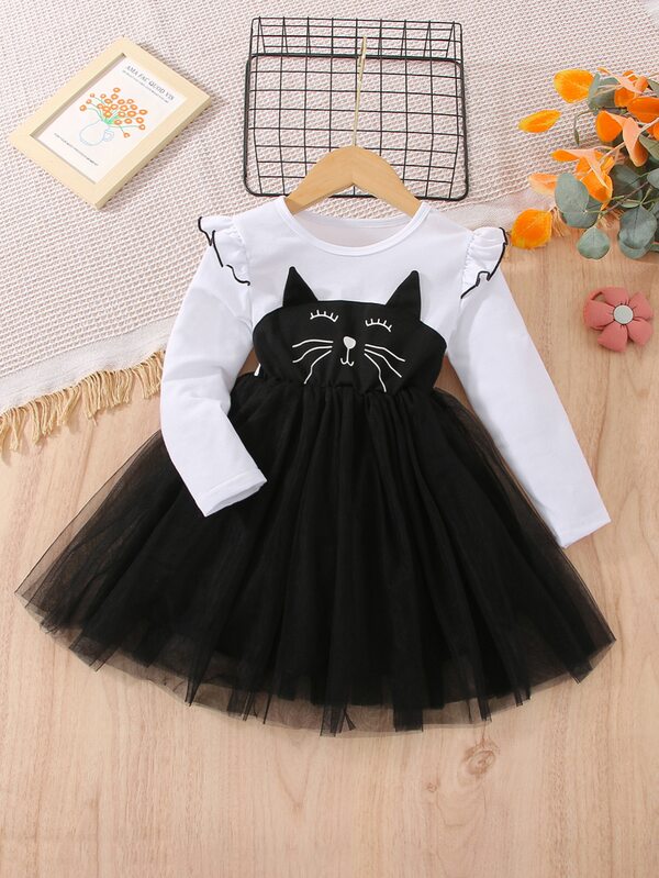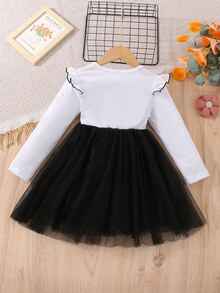 SHEIN Kids QTFun Toddler Girls Cartoon Graphic Ruffle Trim Mesh Hem Dress