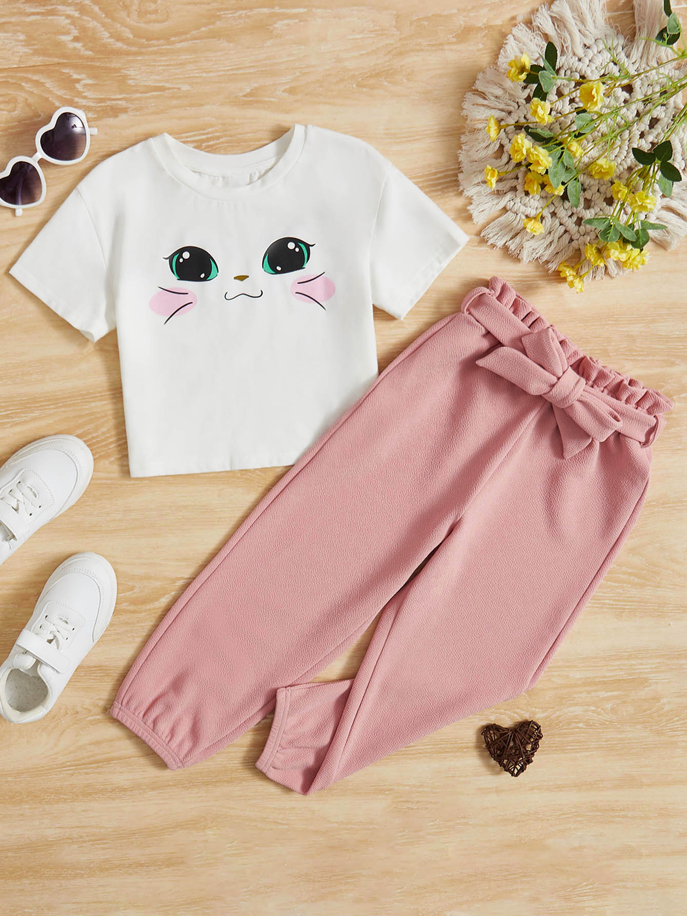 SHEIN Toddler Girls Cartoon Graphic Tee & Paperbag Waist Belted Pants