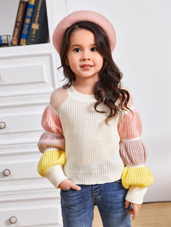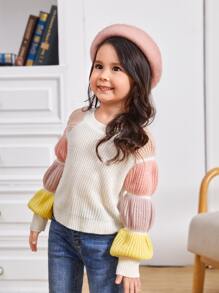 SHEIN Kids FANZEY Young Girl Colorblock Gathered Sleeve Sweater