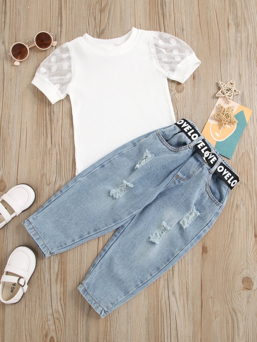 Toddler Girls Contrast Mesh Rib-knit Tee With Ripped Tapered Jeans
