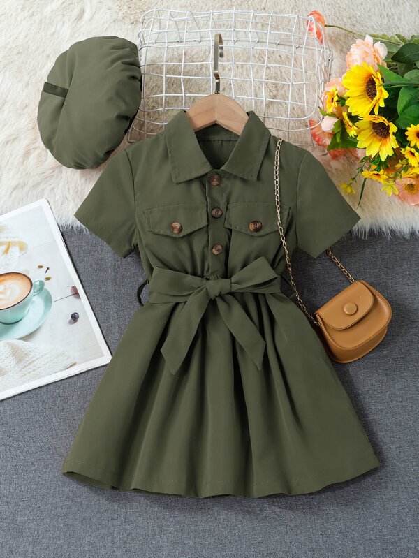 SHEIN Kids FANZEY Young Girl Flap Detail Belted Shirt Dress & Accessory Hat Without Bag