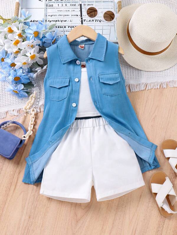 SHEIN Kids EVRYDAY Toddler Girls Flap Pocket Shirt & Shorts & Cami Top Set
