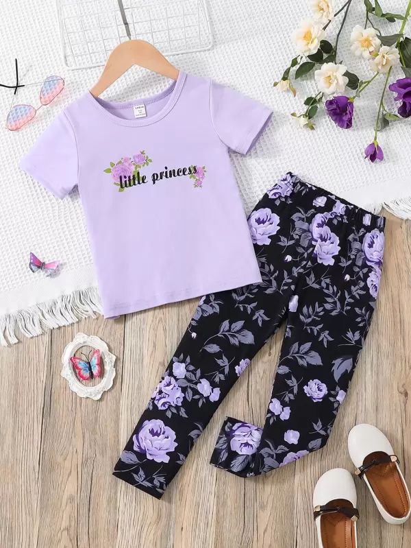 SHEIN Kids QTFun Toddler Girls Floral & Letter Graphic Tee & Leggings