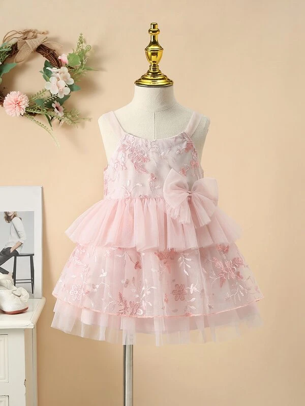 Toddler Girls Floral Embroidery Ruffle Hem Cami Top & Mesh Layered Skirt