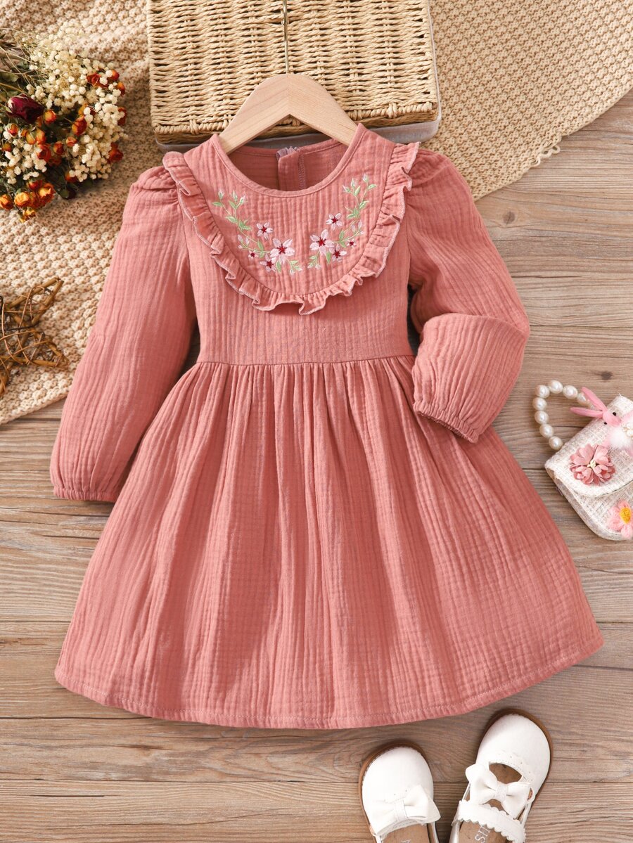 SHEIN Toddler Girls Floral Embroidery Ruffle Trim Dress