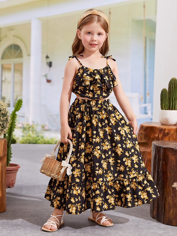 SHEIN Kids SUNSHNE Young Girl Floral Print Cami Top & Ruffle Hem Skirt