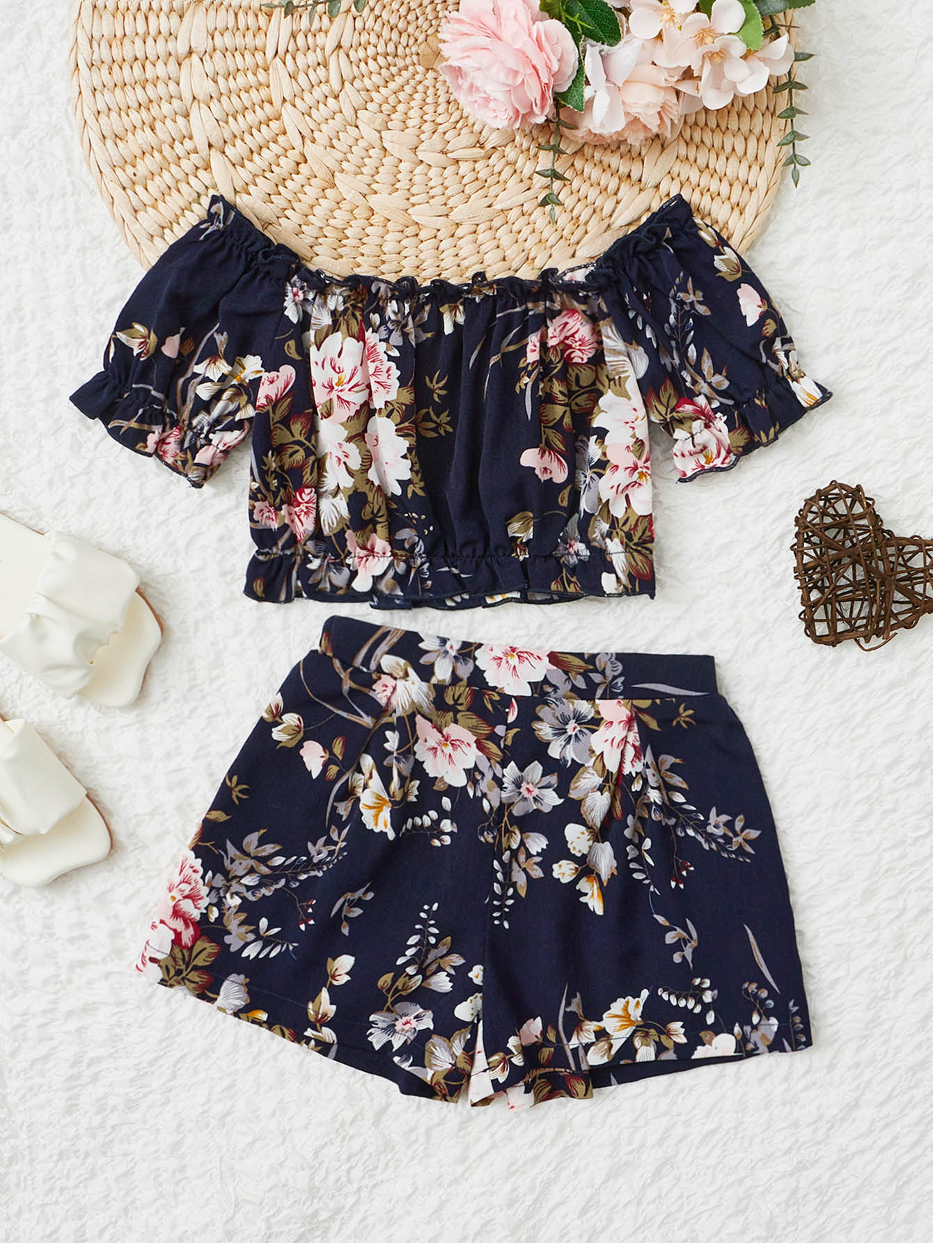 SHEIN Kids EVRYDAY Toddler Girls Floral Print Puff Sleeve Top & Shorts