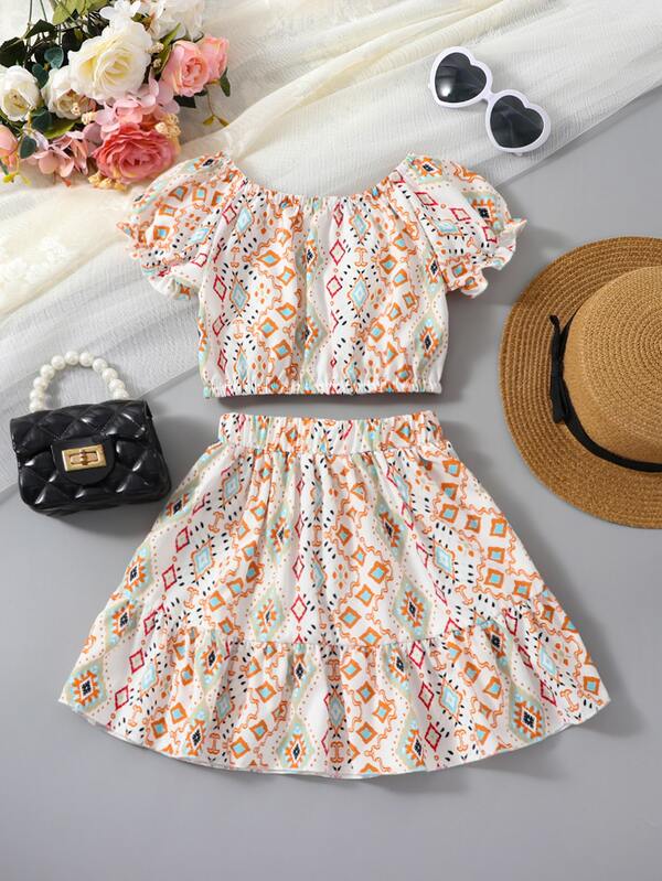 Toddler Girls Geo Print Puff Sleeve Top & Ruffle Hem Skirt