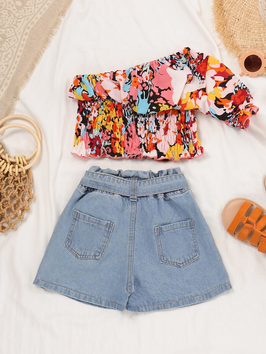 Toddler Girls Graphic Print One Shoulder Top & Belted Denim Shorts