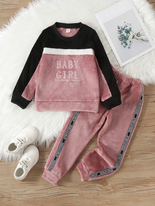 Young Girl Letter Embroidery Color Block Flannel Pullover & Pants