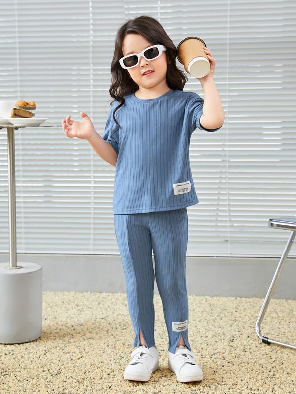 SHEIN Kids EVRYDAY Young Girl Letter Patched Drop Shoulder Tee & Sweatpants
