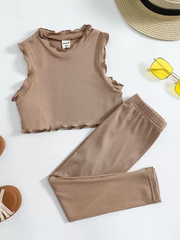 SHEIN Kids EVRYDAY Young Girl Lettuce Trim Ribbed Knit Tank Top & Leggings