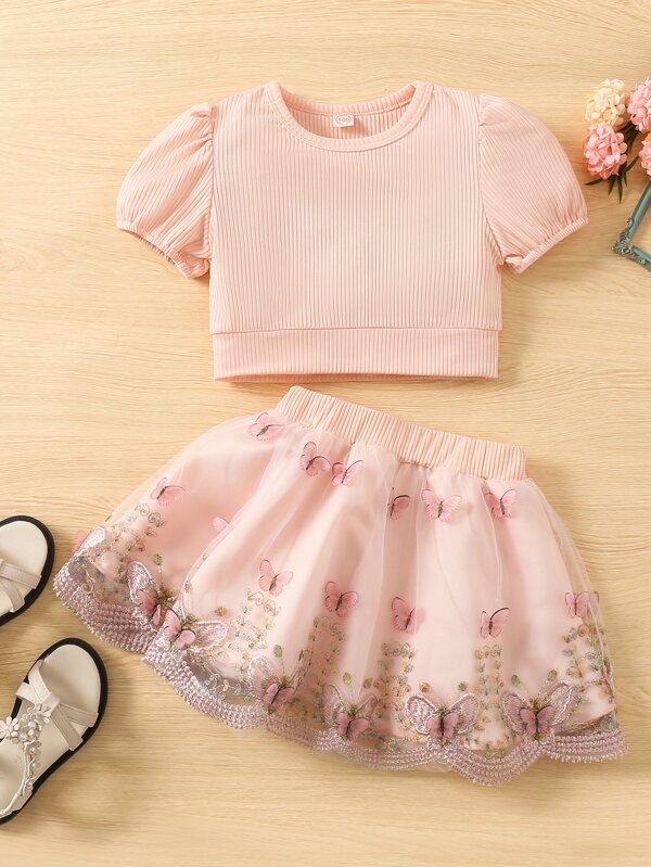 Toddler Girls Puff Sleeve Tee And Butterfly Appliques Skirt