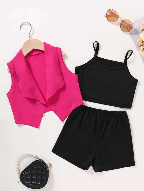 Toddler Girls Shawl Collar Vest Jacket & Shorts & Cami Top