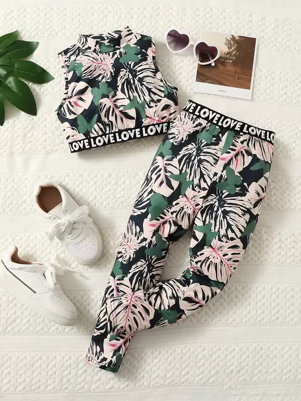 SHEIN Kids HYPEME Young Girl Tropical Print Letter Tape Panel Tank Top & Pants