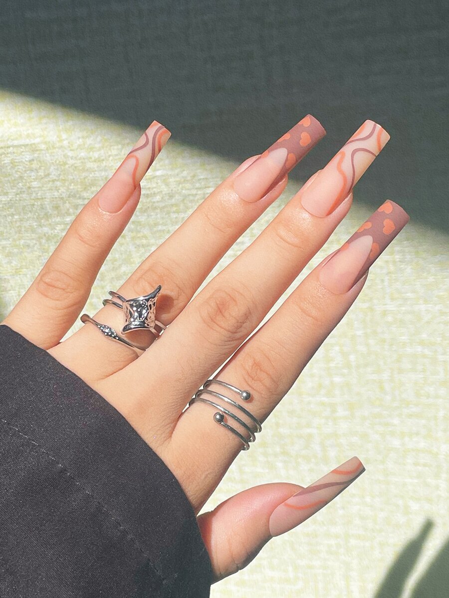 Transform Your Nails with 24pcs Extra Long Coffin Nude Khaki Matte Heart Line Fake Nail & 1sheet Tape & 1pc Nail File