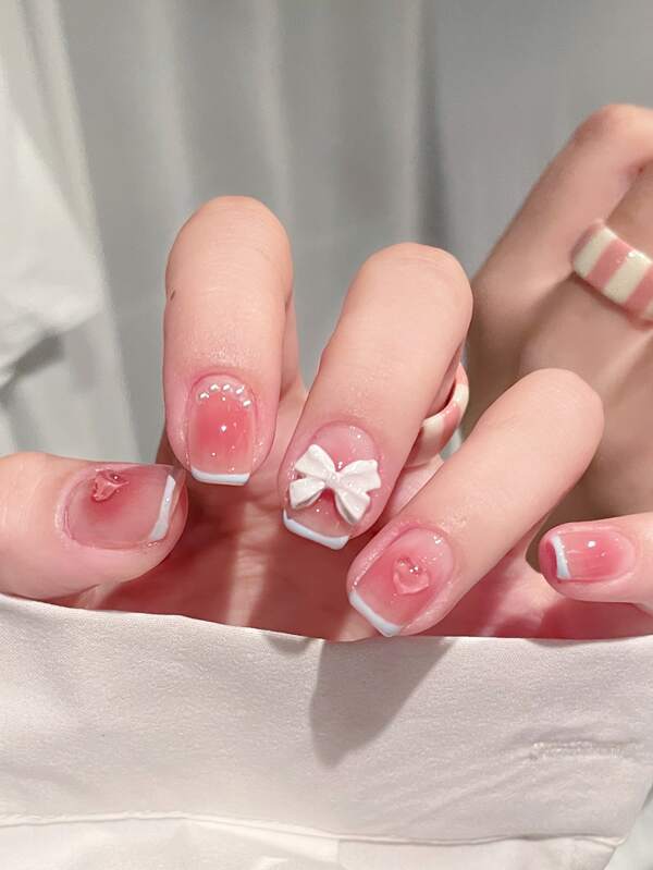 Transform Your Nails with 24pcs Short Square Blush French Heart Bow Decor Fake Nail & 1pc Nail File & 1sheet Tape
