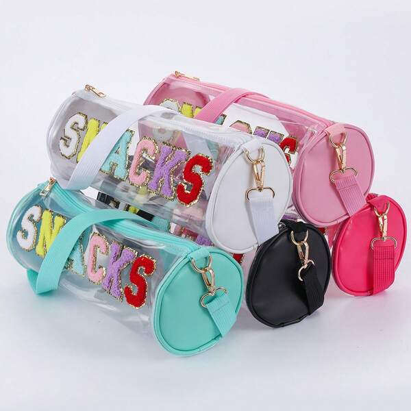 Transparent Cylinder Crossbody Bag, Chenille Letter Embroidery Bucket Bag, Waterproof Round Snack Storage Pouch