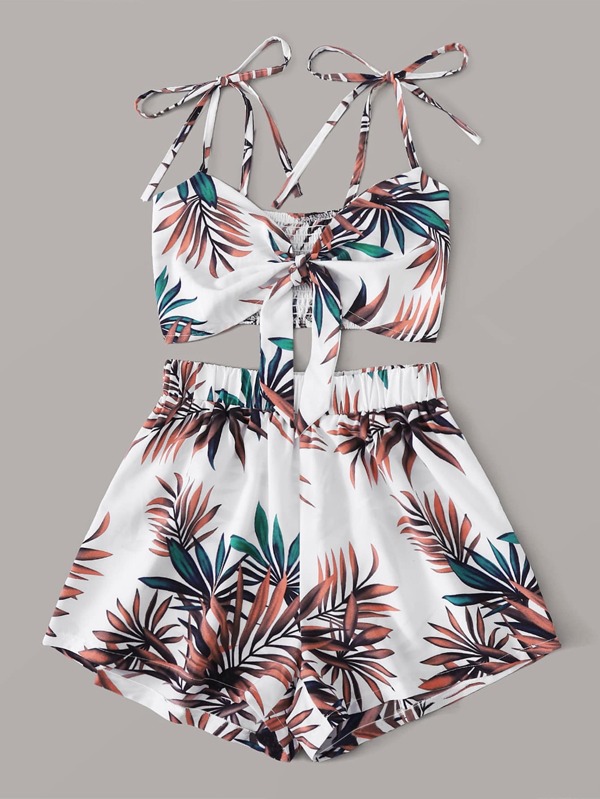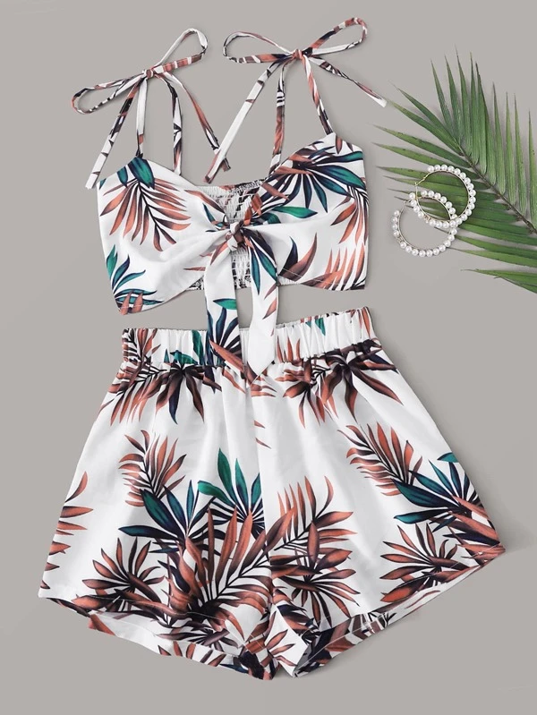 SHEIN VCAY Tropical Print Tie Shoulder Shirred Cami Top With Shorts
