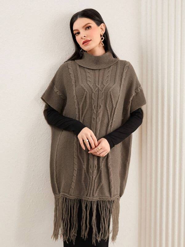 SHEIN Mulvari Turtleneck Batwing Sleeve Fringe Hem Cable Knit Poncho