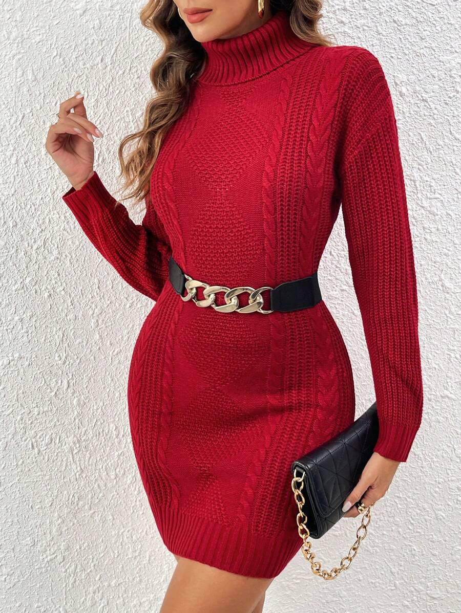 Turtleneck Cable Knit Drop Shoulder Sweater Dress