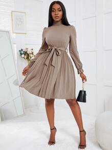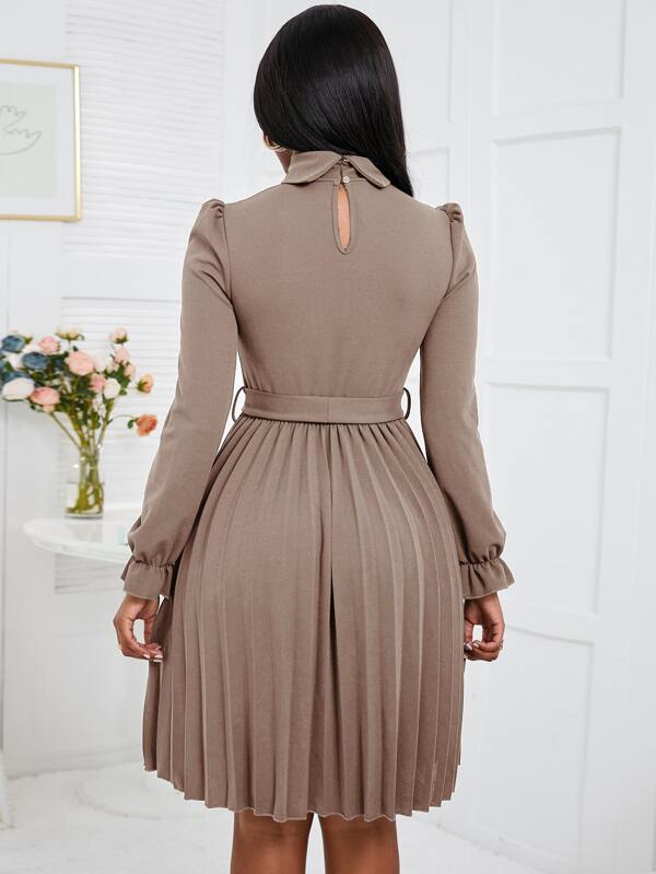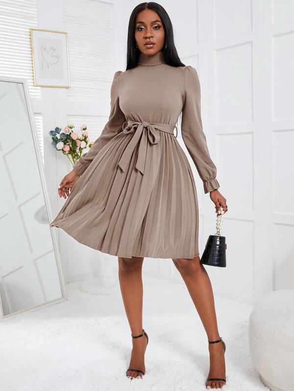SHEIN Privé Turtleneck Flounce Sleeve Pleated Hem Belted Dress