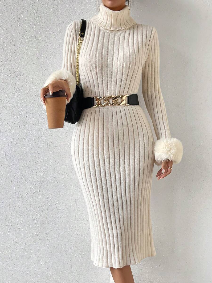 SHEIN Privé Turtleneck Fuzzy Cuff Sweater Dress Without Belt
